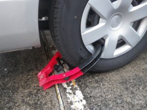 ハンドルロックがハンドル操作を不可能にして盗難を防ぐのに対して、タイヤロックは、タイヤの回転を物理的に制限して、車の走行を阻害するのが目的。