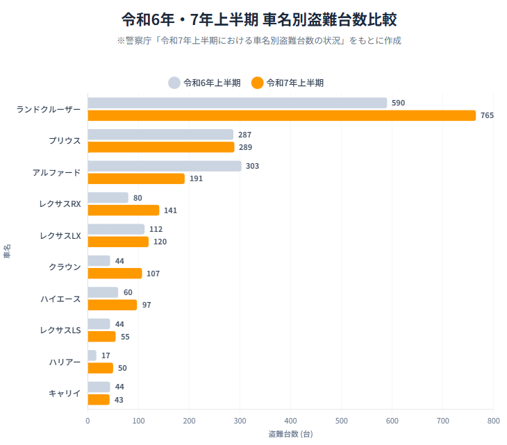 最新の令和7年上半期データを見ると、ワースト1位の「ランドクルーザー」は765台被害に遭い、前年同期(590台)から急増しています。次いで「プリウス」が289台、「アルファード」が191台と続き、これら人気車種だけで被害の多くを占めます。