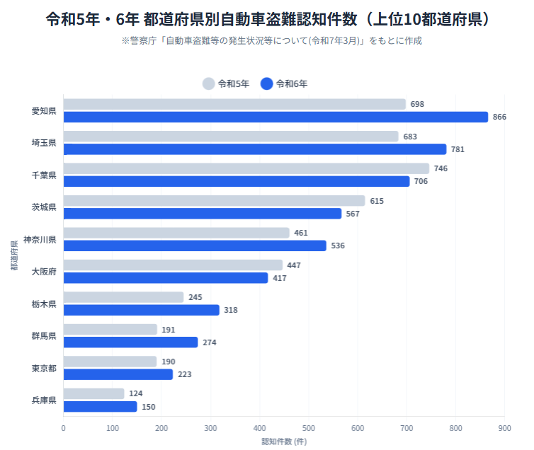 警察庁の資料によると、令和6年の自動車盗難の認知件数は6,080件。毎日約16台以上の車が日本のどこかで盗まれている計算になります。